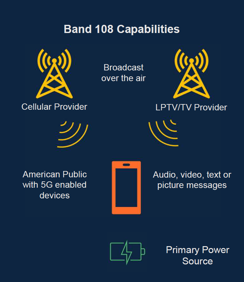 5G Broadcast (Band 108): A technology utilizing cellular Band 108 that allows both cellular and non-cellular operators to broadcast voice, video, text, pictures or data directly to a cell phone or 5G enabled device (e.g., IoT devices) – Per FCC authorization.